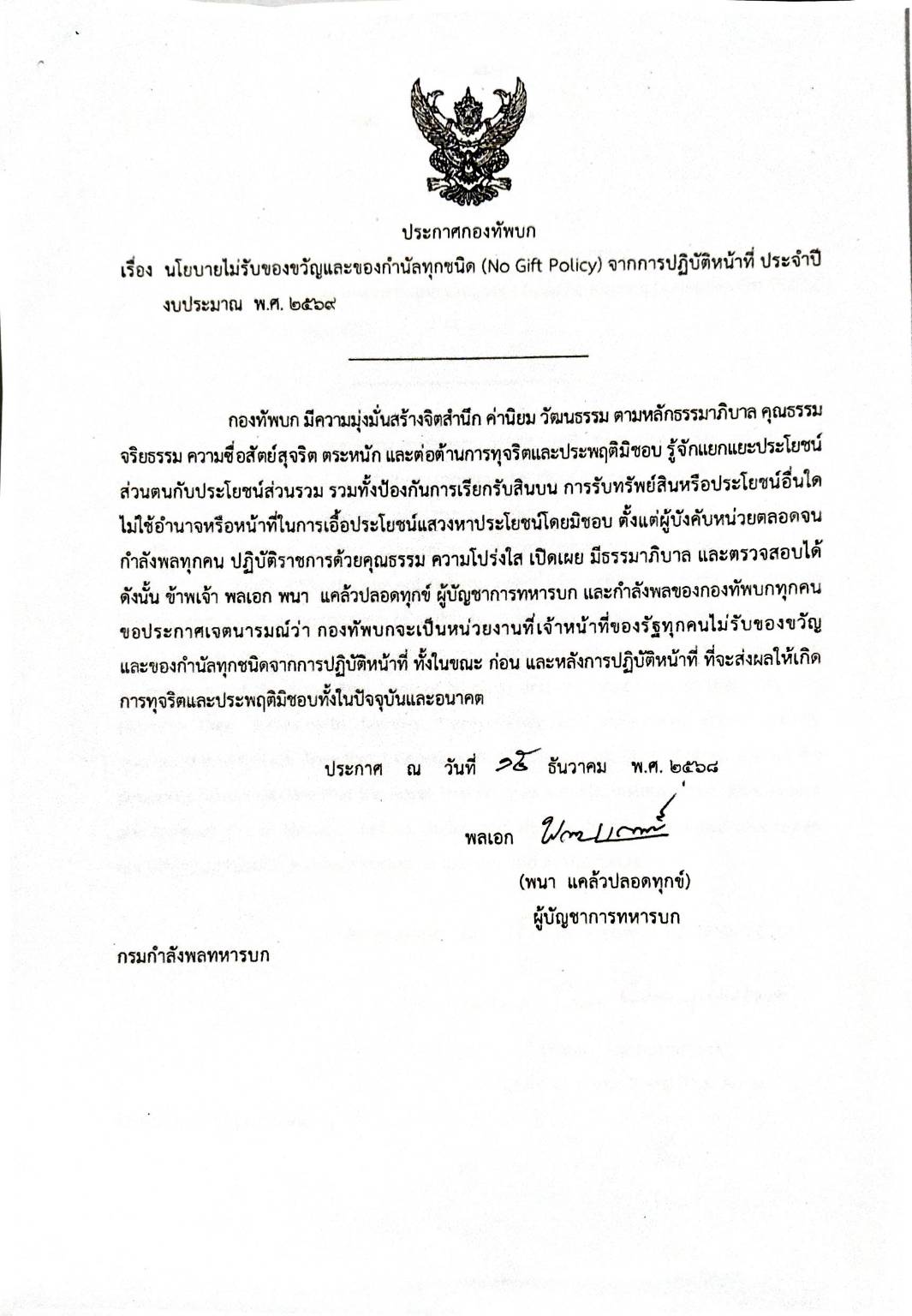 ประกาศกองทัพบก เรื่อง นโยบายไม่รับของขวัญและของกำนัลทุกชนิด (No Gift Policy) จากการปฏิบัติหน้าที่ พ.ศ ๒๕๖๘