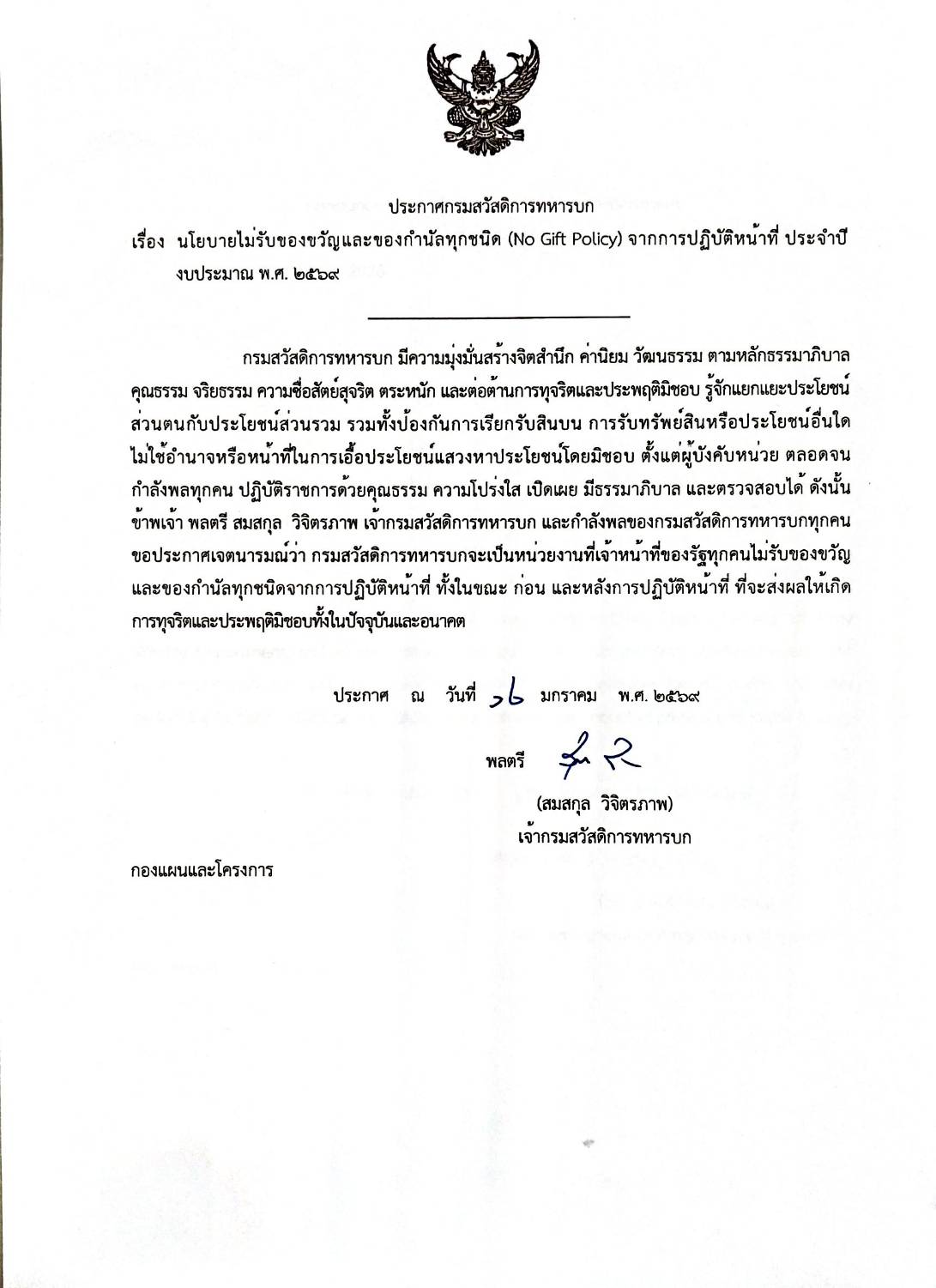 ประกาศกรมสวัสดิการทหารบก นโยบายไม่รับของขวัญ และของกำนัลทุกชนิด (No Gift Policy) จากการปฏิบัติหน้าที่ ประจำปีงบประมาณ 69
