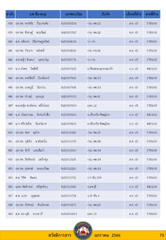 Page 73 - สวัสดีครับท่านผู้อ่านทุกท่าน ก่อนอื่นกระผมขอแนะนำตัวก่อนครับ กระผม พันเอก กัญจน์ณัฎฐ์ นิลนนท์ รับหน้าที่เป็นบรรณาธิการสวัสดิการสารแทน พันเอก สมเกียรติ ถนอมคุ้ม ผู้อำนวยการกองกิจการรร้านสวัสดิการกลาง กรมสวัสดิการทหารบก เนื่องจากท่านมีภารกิจที่มากขึ้น ผู้บังคับบัญชา จึงมอบหมายให้กระผมมารับหน้าที่ต่อจากท่าน แต่ไม่ต้องกังวลครับเพราะว่าหนังสือสวัสดิการสารของเรายังคงมีเนื้อหาสาระน่ารู้ต่าง ๆ ที่เป็นประโยชน์ต่อท่านสมาชิกเช่นเดิม และถ้าสมาชิกท่านใดอยากแนะนำติชม หรือต้องการให้นำเสนอเรื่องใด สามารถแนะนำมาได้ครับ สุดท้ายนี้กองบรรณาธิการสวัสดิการสารขอขอบคุณทุกหน่วยที่ให้การสนับสนุนข้อมูล และภาพถ่ายทำให้หนังสือสวัสดิการสารมีความสมบูรณ์ครบถ้วนทั้งเนื้อหาสาระ และหวังเป็นอย่างยิ่งว่าท่านผู้อ่านจะได้รับความรู้ พร้อมทั้งความบันเทิงจากหนังสือสวัสดิการสารฉบับนี้ครับ