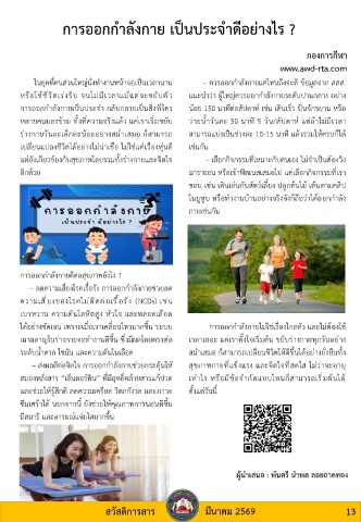 Page 13 - สวัสดีครับท่านผู้อ่านทุกท่าน ก่อนอื่นกระผมขอแนะนำตัวก่อนครับ กระผม พันเอก กัญจน์ณัฎฐ์ นิลนนท์ รับหน้าที่เป็นบรรณาธิการสวัสดิการสารแทน พันเอก สมเกียรติ ถนอมคุ้ม ผู้อำนวยการกองกิจการรร้านสวัสดิการกลาง กรมสวัสดิการทหารบก เนื่องจากท่านมีภารกิจที่มากขึ้น ผู้บังคับบัญชา จึงมอบหมายให้กระผมมารับหน้าที่ต่อจากท่าน แต่ไม่ต้องกังวลครับเพราะว่าหนังสือสวัสดิการสารของเรายังคงมีเนื้อหาสาระน่ารู้ต่าง ๆ ที่เป็นประโยชน์ต่อท่านสมาชิกเช่นเดิม และถ้าสมาชิกท่านใดอยากแนะนำติชม หรือต้องการให้นำเสนอเรื่องใด สามารถแนะนำมาได้ครับ สุดท้ายนี้กองบรรณาธิการสวัสดิการสารขอขอบคุณทุกหน่วยที่ให้การสนับสนุนข้อมูล และภาพถ่ายทำให้หนังสือสวัสดิการสารมีความสมบูรณ์ครบถ้วนทั้งเนื้อหาสาระ และหวังเป็นอย่างยิ่งว่าท่านผู้อ่านจะได้รับความรู้ พร้อมทั้งความบันเทิงจากหนังสือสวัสดิการสารฉบับนี้ครับ