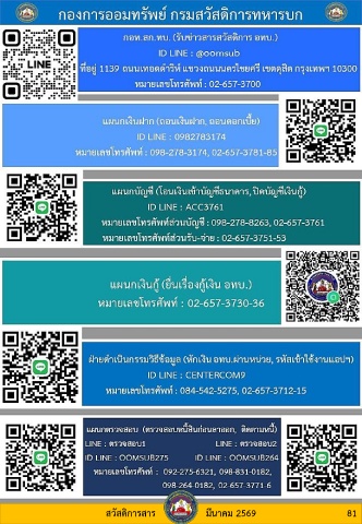 Page 81 - สวัสดีครับท่านผู้อ่านทุกท่าน ก่อนอื่นกระผมขอแนะนำตัวก่อนครับ กระผม พันเอก กัญจน์ณัฎฐ์ นิลนนท์ รับหน้าที่เป็นบรรณาธิการสวัสดิการสารแทน พันเอก สมเกียรติ ถนอมคุ้ม ผู้อำนวยการกองกิจการรร้านสวัสดิการกลาง กรมสวัสดิการทหารบก เนื่องจากท่านมีภารกิจที่มากขึ้น ผู้บังคับบัญชา จึงมอบหมายให้กระผมมารับหน้าที่ต่อจากท่าน แต่ไม่ต้องกังวลครับเพราะว่าหนังสือสวัสดิการสารของเรายังคงมีเนื้อหาสาระน่ารู้ต่าง ๆ ที่เป็นประโยชน์ต่อท่านสมาชิกเช่นเดิม และถ้าสมาชิกท่านใดอยากแนะนำติชม หรือต้องการให้นำเสนอเรื่องใด สามารถแนะนำมาได้ครับ สุดท้ายนี้กองบรรณาธิการสวัสดิการสารขอขอบคุณทุกหน่วยที่ให้การสนับสนุนข้อมูล และภาพถ่ายทำให้หนังสือสวัสดิการสารมีความสมบูรณ์ครบถ้วนทั้งเนื้อหาสาระ และหวังเป็นอย่างยิ่งว่าท่านผู้อ่านจะได้รับความรู้ พร้อมทั้งความบันเทิงจากหนังสือสวัสดิการสารฉบับนี้ครับ