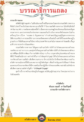 Page 23 - สวัสดีครับท่านผู้อ่านทุกท่าน ก่อนอื่นกระผมขอแนะนำตัวก่อนครับ กระผม พันเอก กัญจน์ณัฎฐ์ นิลนนท์ รับหน้าที่เป็นบรรณาธิการสวัสดิการสารแทน พันเอก สมเกียรติ ถนอมคุ้ม ผู้อำนวยการกองกิจการรร้านสวัสดิการกลาง กรมสวัสดิการทหารบก เนื่องจากท่านมีภารกิจที่มากขึ้น ผู้บังคับบัญชา จึงมอบหมายให้กระผมมารับหน้าที่ต่อจากท่าน แต่ไม่ต้องกังวลครับเพราะว่าหนังสือสวัสดิการสารของเรายังคงมีเนื้อหาสาระน่ารู้ต่าง ๆ ที่เป็นประโยชน์ต่อท่านสมาชิกเช่นเดิม และถ้าสมาชิกท่านใดอยากแนะนำติชม หรือต้องการให้นำเสนอเรื่องใด สามารถแนะนำมาได้ครับ สุดท้ายนี้กองบรรณาธิการสวัสดิการสารขอขอบคุณทุกหน่วยที่ให้การสนับสนุนข้อมูล และภาพถ่ายทำให้หนังสือสวัสดิการสารมีความสมบูรณ์ครบถ้วนทั้งเนื้อหาสาระ และหวังเป็นอย่างยิ่งว่าท่านผู้อ่านจะได้รับความรู้ พร้อมทั้งความบันเทิงจากหนังสือสวัสดิการสารฉบับนี้ครับ