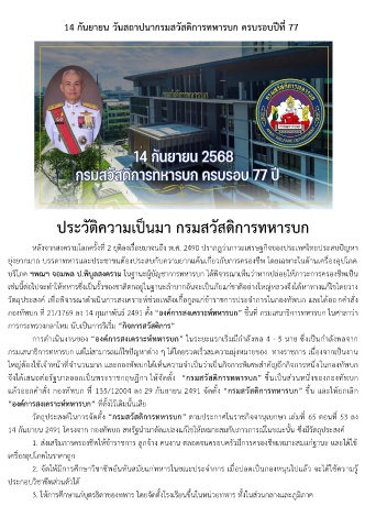 14 กันยายน วันสถาปนากรมสวัสดิการทหารบก ครบรอบปีที่ 77