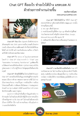 Page 33 - สวัสดีครับท่านผู้อ่านทุกท่าน ก่อนอื่นกระผมขอแนะนำตัวก่อนครับ กระผม พันเอก กัญจน์ณัฎฐ์ นิลนนท์ รับหน้าที่เป็นบรรณาธิการสวัสดิการสารแทน พันเอก สมเกียรติ ถนอมคุ้ม ผู้อำนวยการกองกิจการรร้านสวัสดิการกลาง กรมสวัสดิการทหารบก เนื่องจากท่านมีภารกิจที่มากขึ้น ผู้บังคับบัญชา จึงมอบหมายให้กระผมมารับหน้าที่ต่อจากท่าน แต่ไม่ต้องกังวลครับเพราะว่าหนังสือสวัสดิการสารของเรายังคงมีเนื้อหาสาระน่ารู้ต่าง ๆ ที่เป็นประโยชน์ต่อท่านสมาชิกเช่นเดิม และถ้าสมาชิกท่านใดอยากแนะนำติชม หรือต้องการให้นำเสนอเรื่องใด สามารถแนะนำมาได้ครับ สุดท้ายนี้กองบรรณาธิการสวัสดิการสารขอขอบคุณทุกหน่วยที่ให้การสนับสนุนข้อมูล และภาพถ่ายทำให้หนังสือสวัสดิการสารมีความสมบูรณ์ครบถ้วนทั้งเนื้อหาสาระ และหวังเป็นอย่างยิ่งว่าท่านผู้อ่านจะได้รับความรู้ พร้อมทั้งความบันเทิงจากหนังสือสวัสดิการสารฉบับนี้ครับ