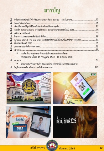 Page 12 - สวัสดีครับท่านผู้อ่านทุกท่าน ก่อนอื่นกระผมขอแนะนำตัวก่อนครับ กระผม พันเอก กัญจน์ณัฎฐ์ นิลนนท์ รับหน้าที่เป็นบรรณาธิการสวัสดิการสารแทน พันเอก สมเกียรติ ถนอมคุ้ม ผู้อำนวยการกองกิจการรร้านสวัสดิการกลาง กรมสวัสดิการทหารบก เนื่องจากท่านมีภารกิจที่มากขึ้น ผู้บังคับบัญชา จึงมอบหมายให้กระผมมารับหน้าที่ต่อจากท่าน แต่ไม่ต้องกังวลครับเพราะว่าหนังสือสวัสดิการสารของเรายังคงมีเนื้อหาสาระน่ารู้ต่าง ๆ ที่เป็นประโยชน์ต่อท่านสมาชิกเช่นเดิม และถ้าสมาชิกท่านใดอยากแนะนำติชม หรือต้องการให้นำเสนอเรื่องใด สามารถแนะนำมาได้ครับ สุดท้ายนี้กองบรรณาธิการสวัสดิการสารขอขอบคุณทุกหน่วยที่ให้การสนับสนุนข้อมูล และภาพถ่ายทำให้หนังสือสวัสดิการสารมีความสมบูรณ์ครบถ้วนทั้งเนื้อหาสาระ และหวังเป็นอย่างยิ่งว่าท่านผู้อ่านจะได้รับความรู้ พร้อมทั้งความบันเทิงจากหนังสือสวัสดิการสารฉบับนี้ครับ