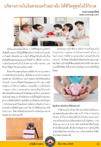 Page 21 - สวัสดีครับท่านผู้อ่านทุกท่าน ก่อนอื่นกระผมขอแนะนำตัวก่อนครับ กระผม พันเอก กัญจน์ณัฎฐ์ นิลนนท์ รับหน้าที่เป็นบรรณาธิการสวัสดิการสารแทน พันเอก สมเกียรติ ถนอมคุ้ม ผู้อำนวยการกองกิจการรร้านสวัสดิการกลาง กรมสวัสดิการทหารบก เนื่องจากท่านมีภารกิจที่มากขึ้น ผู้บังคับบัญชา จึงมอบหมายให้กระผมมารับหน้าที่ต่อจากท่าน แต่ไม่ต้องกังวลครับเพราะว่าหนังสือสวัสดิการสารของเรายังคงมีเนื้อหาสาระน่ารู้ต่าง ๆ ที่เป็นประโยชน์ต่อท่านสมาชิกเช่นเดิม และถ้าสมาชิกท่านใดอยากแนะนำติชม หรือต้องการให้นำเสนอเรื่องใด สามารถแนะนำมาได้ครับ สุดท้ายนี้กองบรรณาธิการสวัสดิการสารขอขอบคุณทุกหน่วยที่ให้การสนับสนุนข้อมูล และภาพถ่ายทำให้หนังสือสวัสดิการสารมีความสมบูรณ์ครบถ้วนทั้งเนื้อหาสาระ และหวังเป็นอย่างยิ่งว่าท่านผู้อ่านจะได้รับความรู้ พร้อมทั้งความบันเทิงจากหนังสือสวัสดิการสารฉบับนี้ครับ
