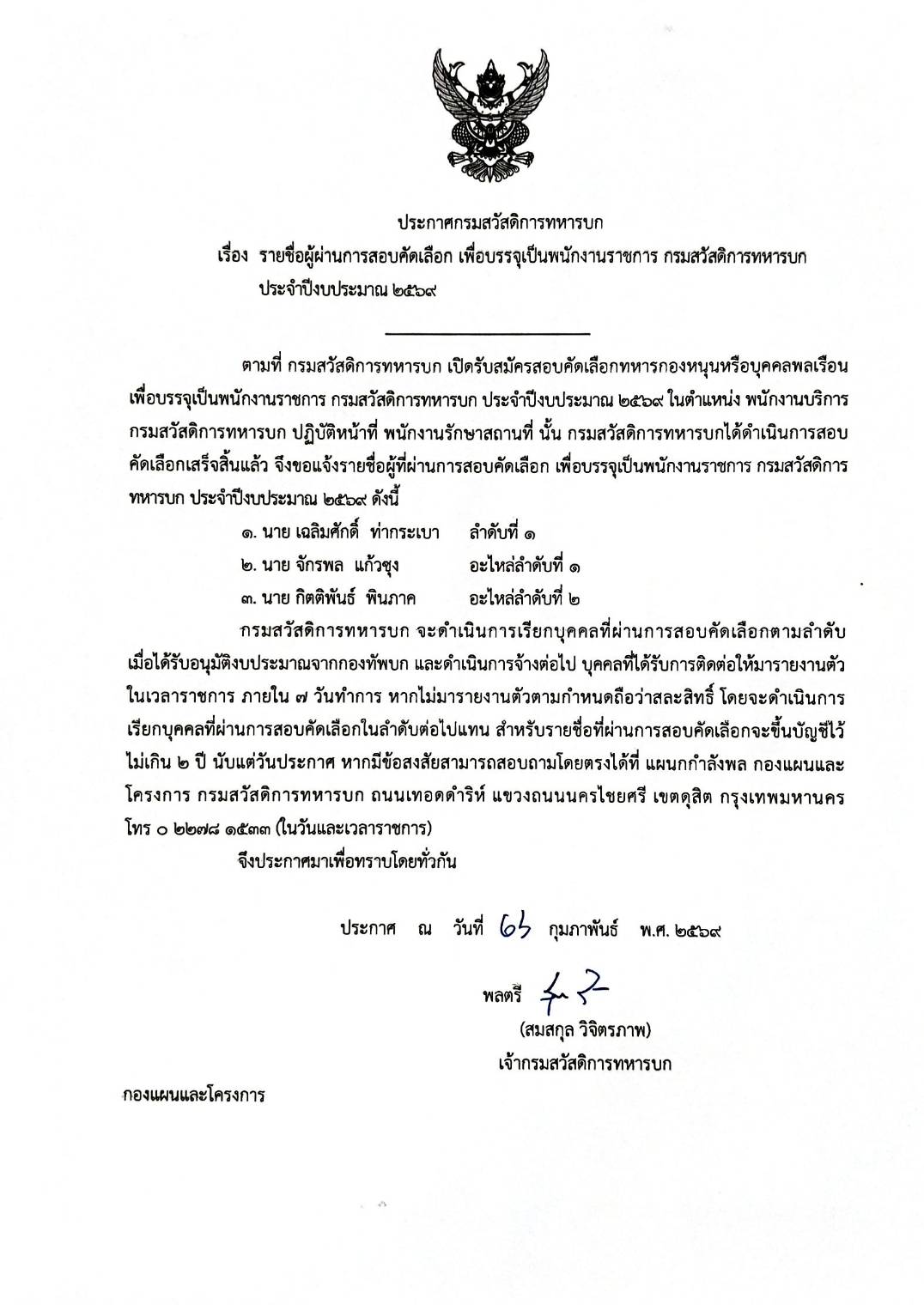 ประกาศ รายชื่อผู้ผ่านการสอบคัดเลือกเพื่อบรรจุเป็นนายทหารประทวน สก.ทบ. (อัตรา ส.อ.) ประจำปีงบประมาณ 69